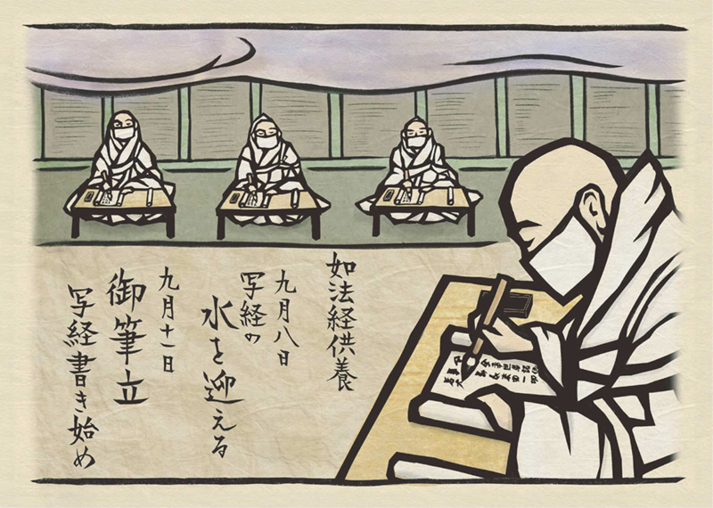 九月八日に写経用の水が迎えられた。出家年数の低い僧達が比叡山横川まで登り、慈覚大師円仁が如法経で用いられたという根本の水を汲んで銅の瓶に入れて持ち帰った。そして十一日、御筆立(写経書き始め)が行われた。慈鎮和尚慈円と観性法橋は写経衆ではなかったが、元から如法経の最中であったということもあり、写経衆に加わった。法然 上人が啓白を申し述べ、行道と伽陀の後、十六人全員が着座 して同時に 筆を執って書写を始められた。