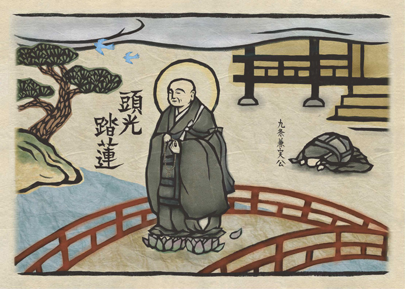 元久二年四月五日、法然上人は九条兼実公の月輪殿に招かれ、数時間の法談をされた。兼実公は上人がお帰りになるとき、庭先に崩れるように降りられ、額を地につけて礼拝をした。なせなら、兼実公には法然上人が宙で蓮華を踏み、頭上に光明を輝かせている姿が見えたのである法然上人が庭の池の橋を渡られるとき、頭光ははっきりと見えた。それ以来、その橋は〈頭光の橋〉と呼ばれるようになった。