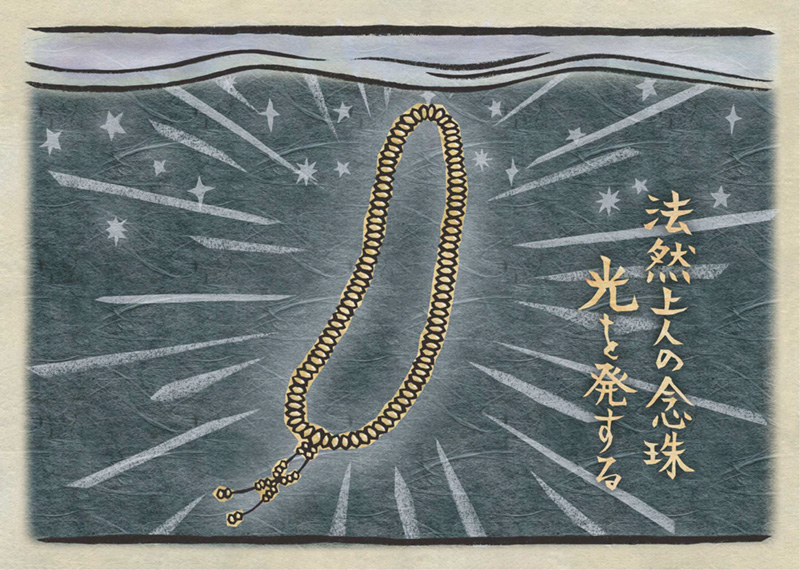 ある人が、法然上人から念珠をいただいた。その人は夜も昼もその念珠でお念仏を称えていた。ある日、念珠を部屋の竹くぎに掛けていたところ、その部屋の中が明るく照り輝いた。法然上人の念珠が光を発していたのだ。それはまるで晴れ渡る夜空に浮かぶ星のように、玉の一つ一つが美しく明るく光輝いていたのであった。