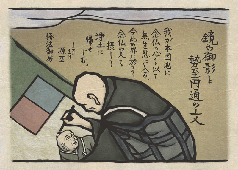 法然上人の弟子である勝法房は、上人の肖像画を描き、それに銘文を書いていただくことをお願いした。上人はその絵をご覧になると、鏡二面を両手に持ち、水を張った器を前において、ご自分の頂の前後を見比べた。そして、その絵に胡粉を塗って訂正の筆を加え「これこそ似たれ」と仰って勝法房に与えられた。銘文は後日、紙に『首楞厳経』の〈勢至円通の文〉を書いて授けられた。勝法房はその文を肖像画に貼り付けて帰依し敬った。